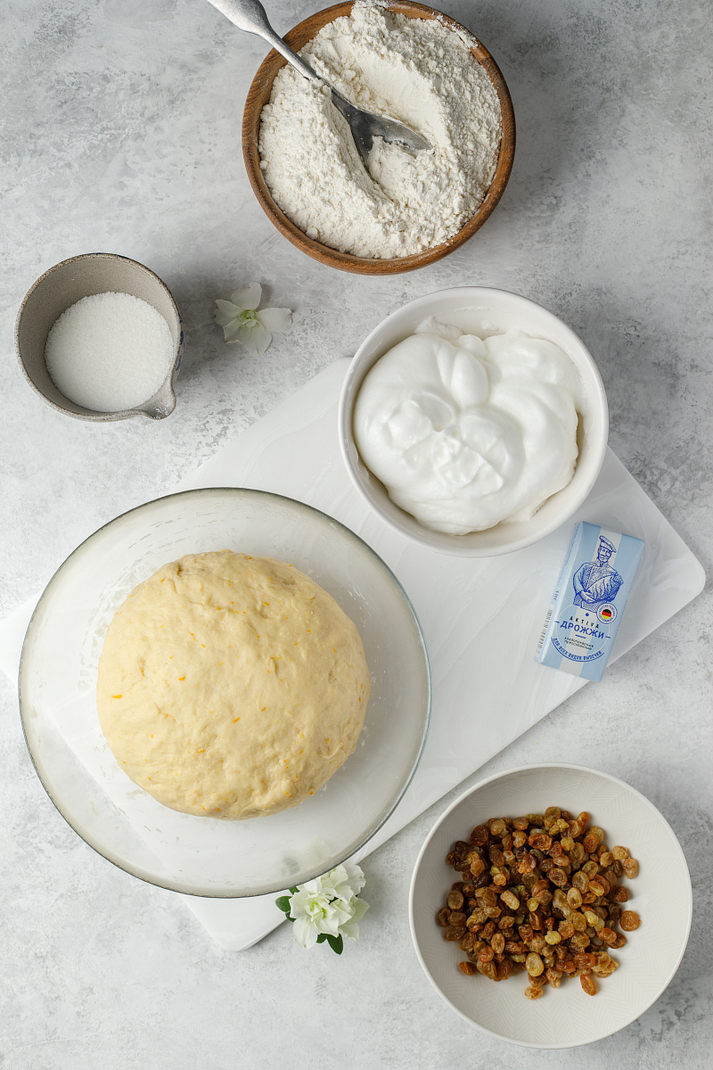 Добавить в тесто 2 белка, взбитые с остальным сахаром до крутых пиков. Вымесить тесто подсыпая в него изюм. Тесто оставить, накрыв, на 2,5-3 часа подходить. За это время несколько раз обмять.