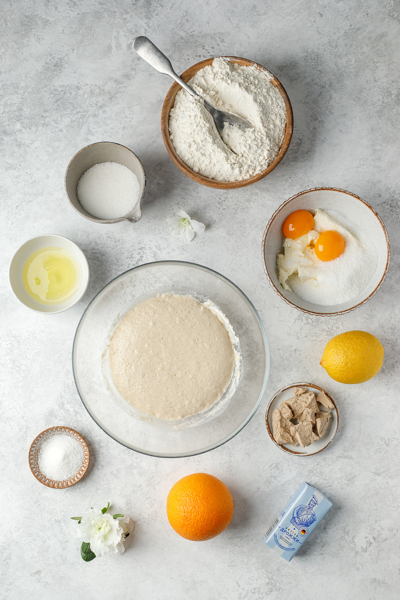 Желтки растереть с 1/3 рецептурного сахара, добавить цедру одного лимона и апельсина, мягкое сливочное масло и ванильный сахар. Растереть до однородной массы. Добавить подошедшую опару, соль, и постепенно всыпая муку замесить тесто пока оно не будет отставать от рук.